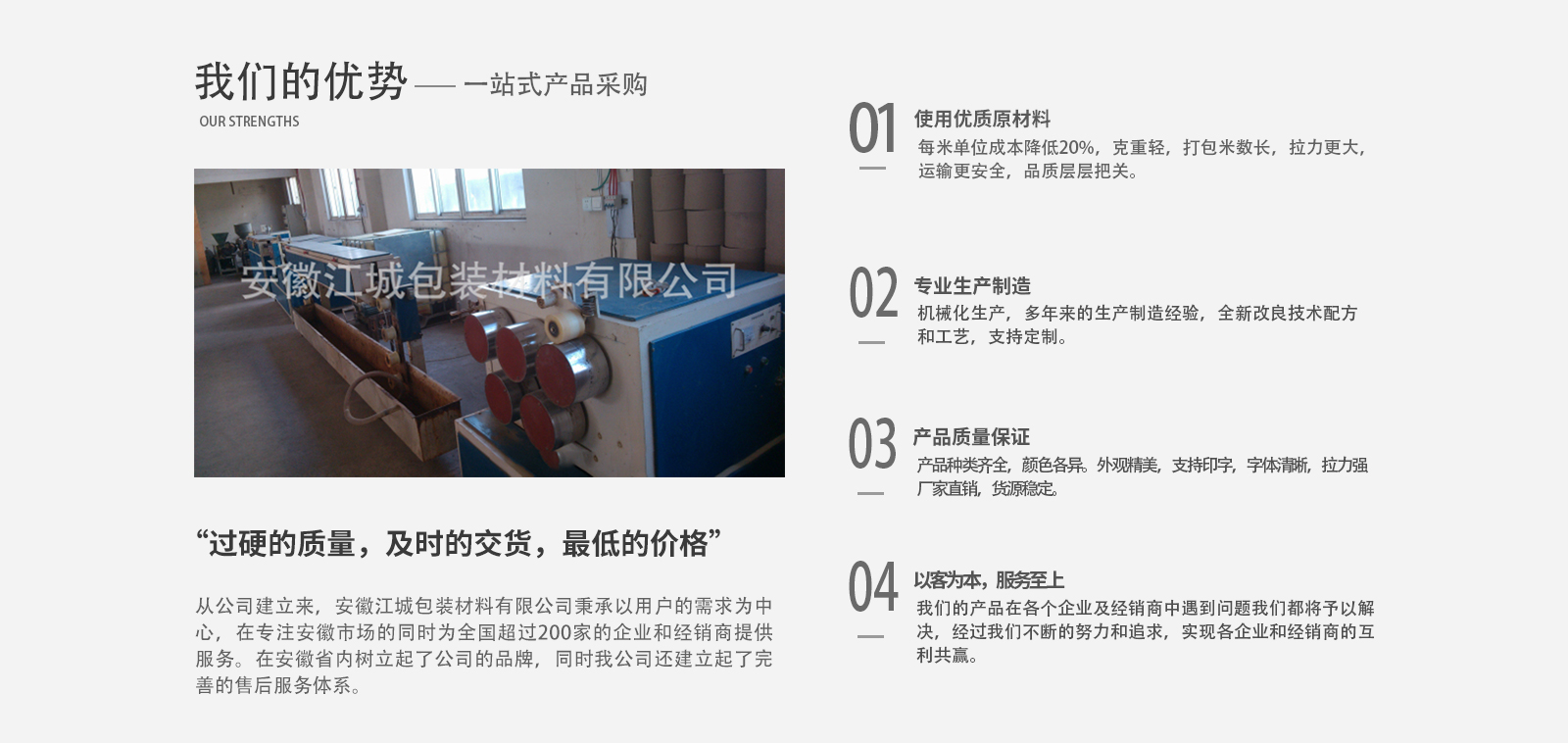 安徽江城包裝材料有限公司成立于2008年,注冊(cè)于2010年,公司總部設(shè)立在安徽蕪湖,是安徽省內(nèi)專業(yè)生產(chǎn)與銷售打包帶、透明膠帶的公司之一。公司主要效勞于大中小企業(yè),并大力開發(fā)省內(nèi)經(jīng)銷商。公司以“過硬的質(zhì)量,及時(shí)的交貨,低的價(jià)格”,為企業(yè)的立身之本。希望用我們的不懈努力,帶給我們客戶大的效益。從公司建立來,安徽江城包裝材料有限公司秉承以用戶的需求為中心,在專注安徽市場(chǎng)的同時(shí)為全國(guó)超過200家的企業(yè)和經(jīng)銷商提供服務(wù),“過硬的質(zhì)量,及時(shí)的交貨,低的價(jià)格”博得了縱多的企業(yè)和經(jīng)銷商的好評(píng),在安徽省內(nèi)逐步樹立起了公司的品牌,同時(shí)我公司還建立起了完善的售后服務(wù)體系。為我們的產(chǎn)品在各個(gè)企業(yè)及經(jīng)銷商中遇到的問題予以解決,經(jīng)過我們不斷的努力和追求,實(shí)現(xiàn)各企業(yè)和經(jīng)銷商的互利共贏。
